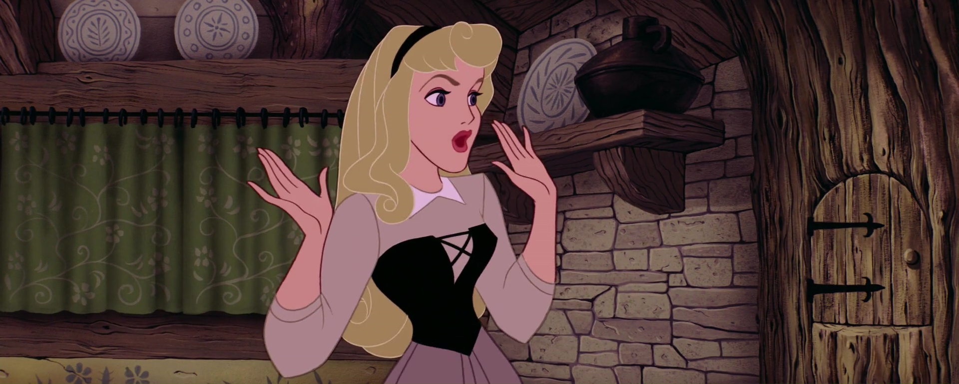 A son retour, Aurore découvre une fête surprise pour son anniversaire, composée d’une belle robe et d’un grand gâteau. Elle annonce aux fées qu’elle a trouvé l’amour auprès d’un inconnu. Elle apprend alors qu’elle est une princesse et que le soir même elle doit se rendre au château pour retrouver ses parents. En larmes, elle s’enferme dans sa chambre en sachant qu’elle ne reverrait jamais Philippe.