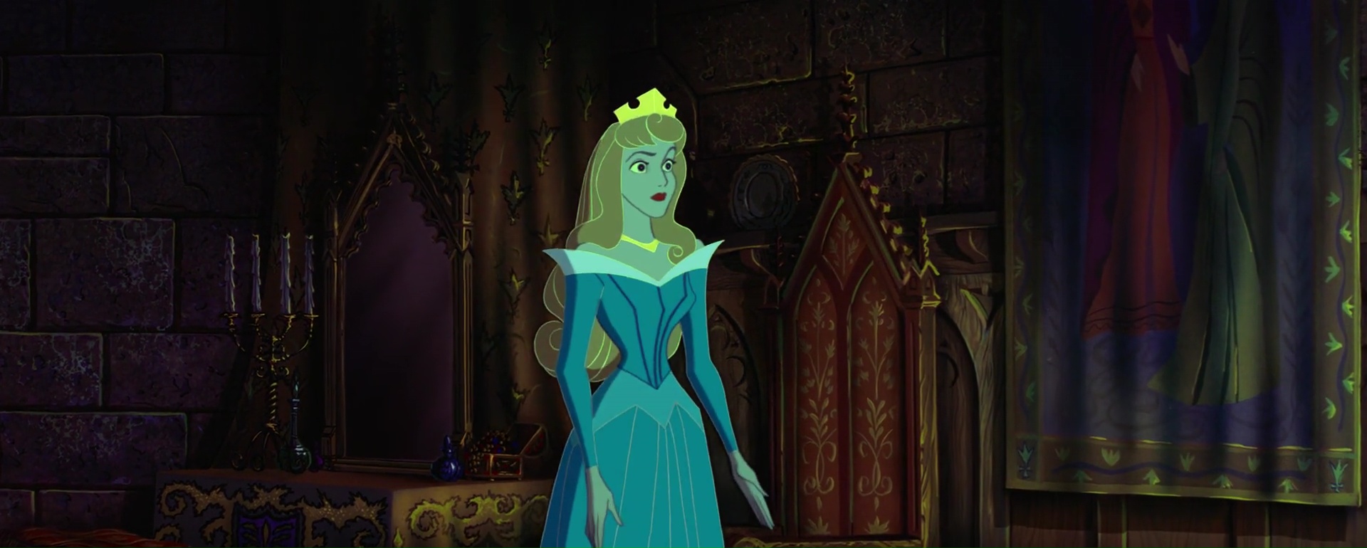 Aurore est donc conduite au château où elle reçoit sa couronne de princesse. Elle est alors attirée par une lumière verte hypnotique qui n’est autre que Maléfique. Conduite à l’écart, elle se met à toucher une quenouille et sombre dans un profond sommeil.