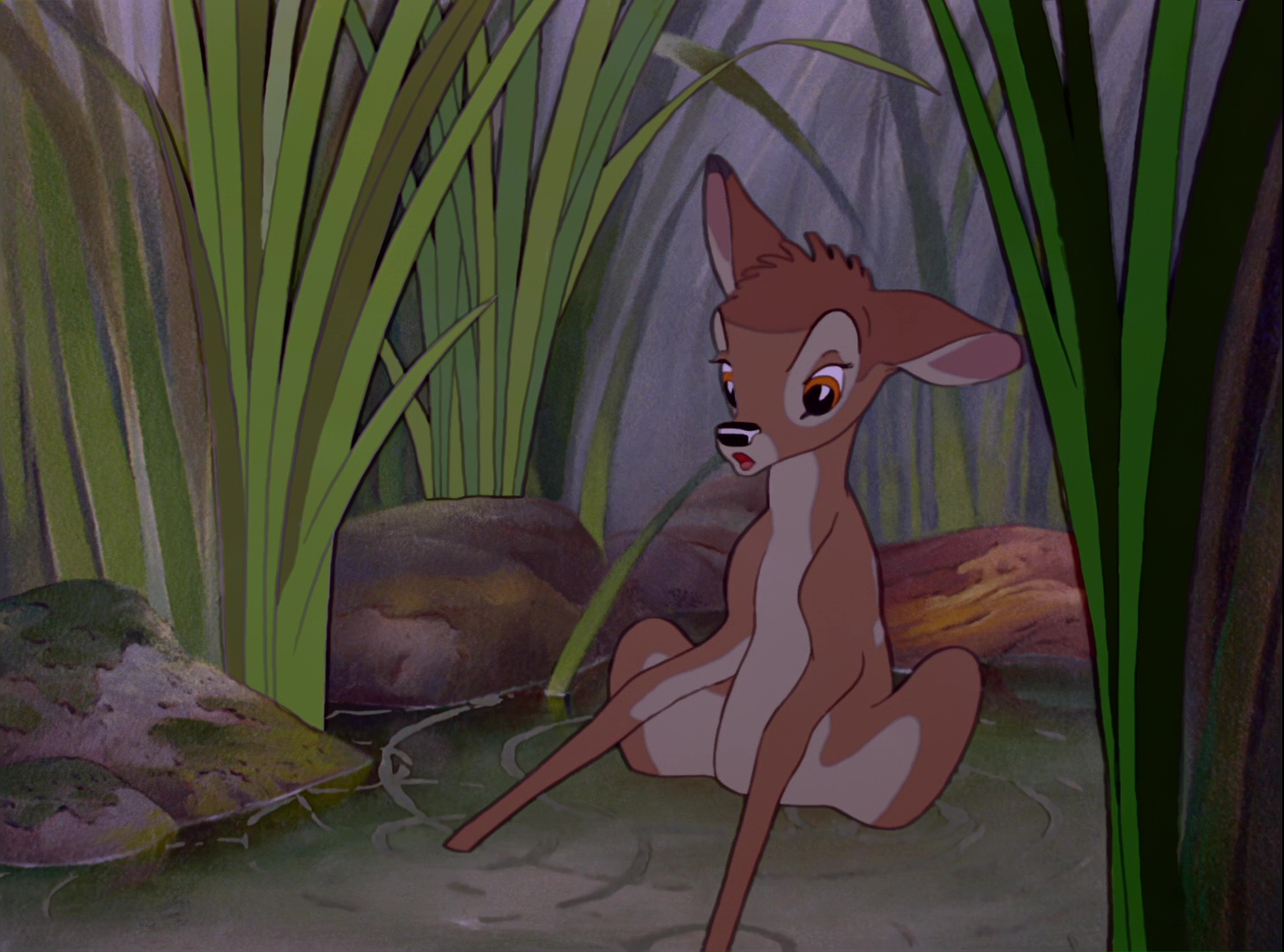 Bambi rentre auprès de sa mère et vit son premier orage pluvieux et en a peur. Une fois passé, sa mère le conduit vers la prairie où il s’empresse d’aller avant de se faire stopper par elle pour lui apprendre à faire attention aux dangers qui rôdent. Il profite du lieu et retrouve Panpan avec qui il passe un moment. Il se met à suivre un crapaud et tombe sur un petit étang où il va faire la rencontre de Féline qui lui fait peur au début.