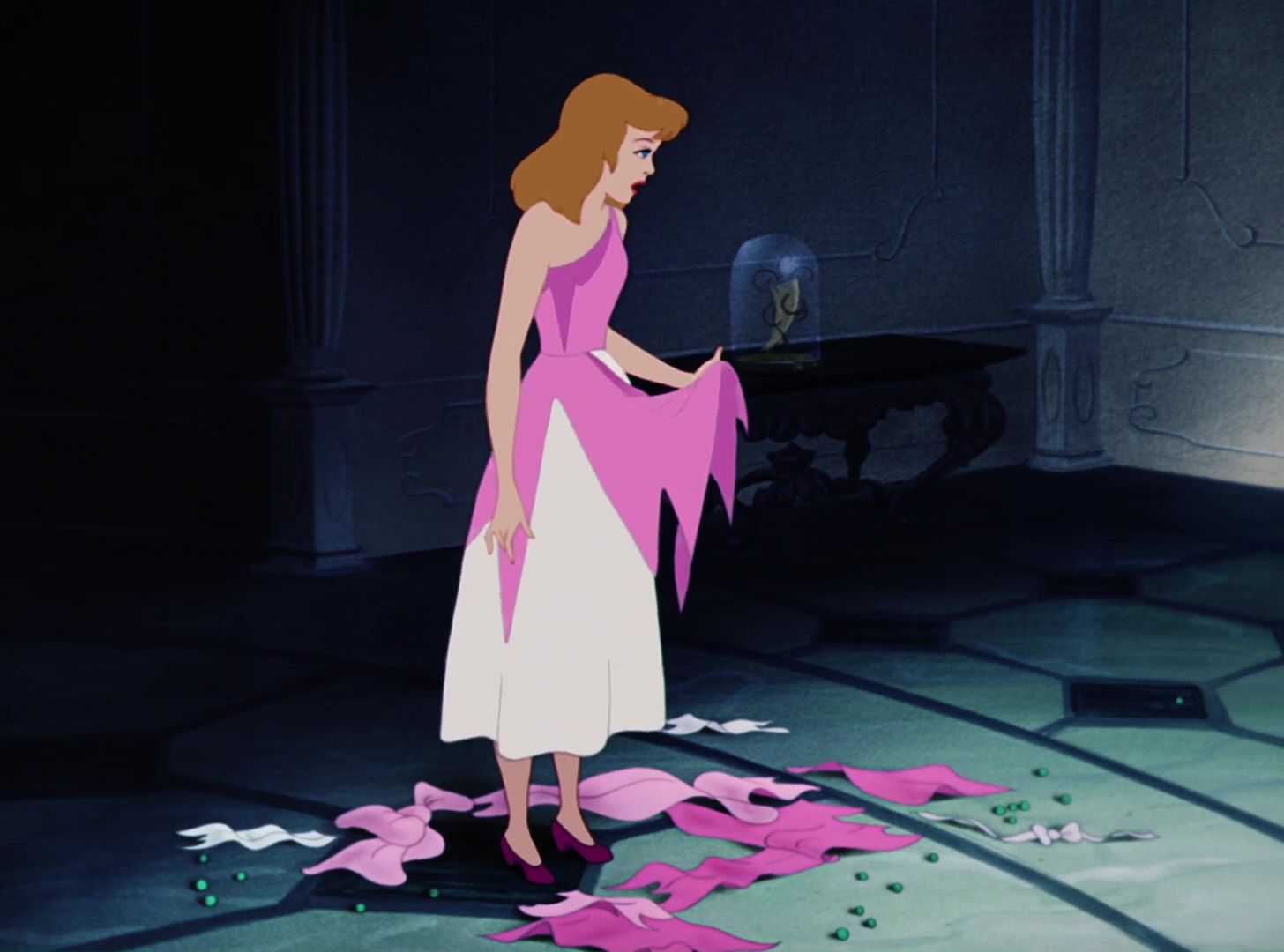 Rêveuse, elle part préparer sa robe mais la liste des corvées s’allonge. Quand elle revient, elle découvre sa robe et en est heureuse. Elle se dépêche de retrouver sa belle famille pour aller au bal mais Anastasie et Javotte lui déchire complètement sa robe. Attristée, elle part en pleurs dans les jardins et est dégoûtée de sa vie.
