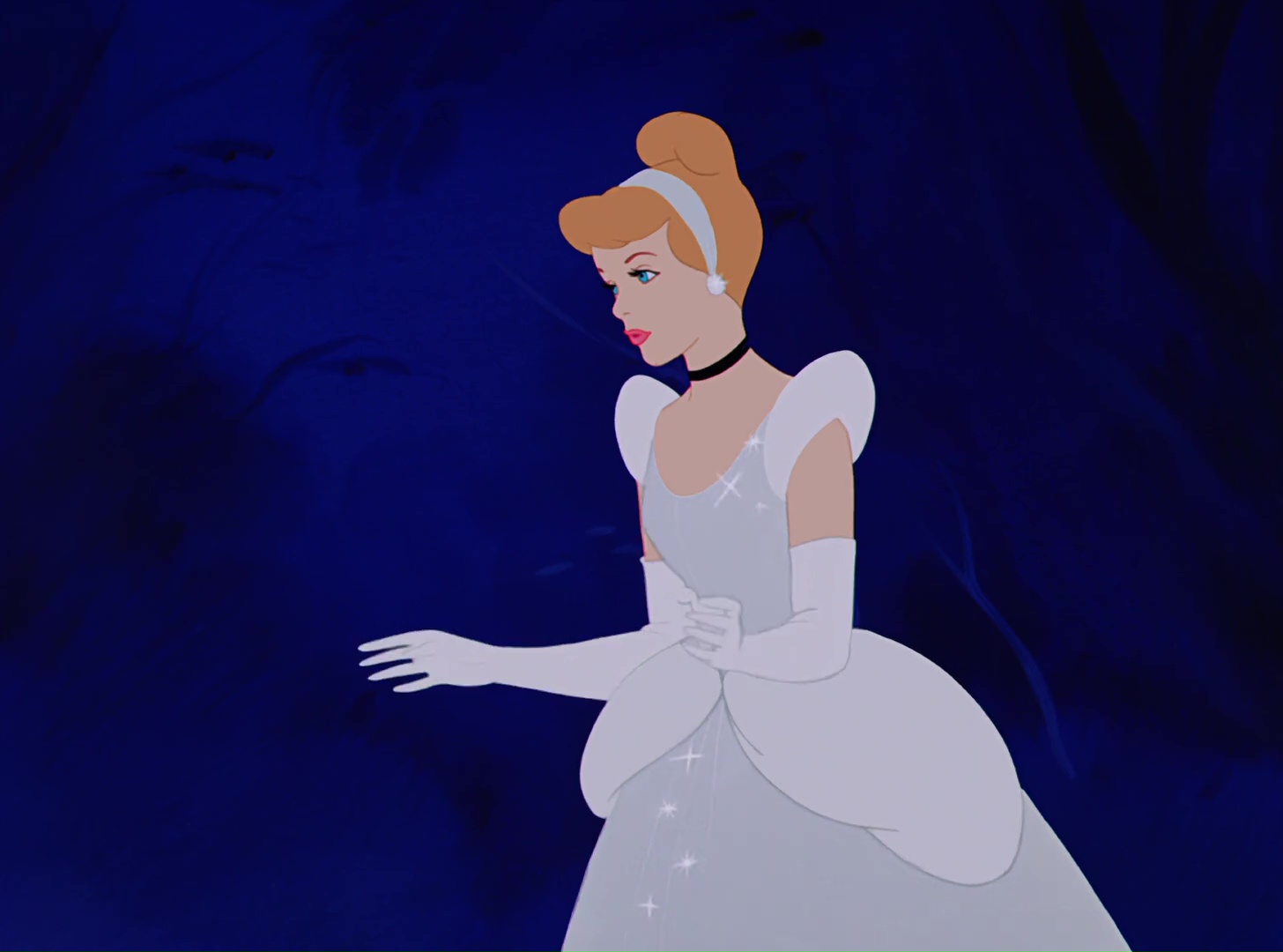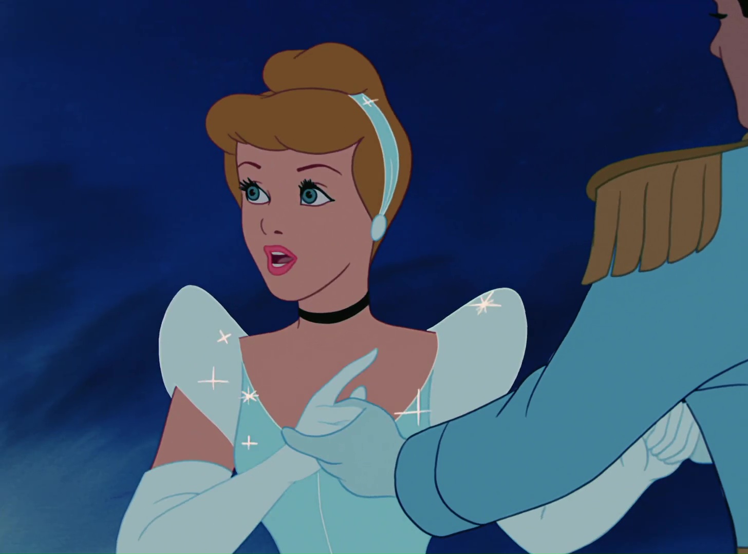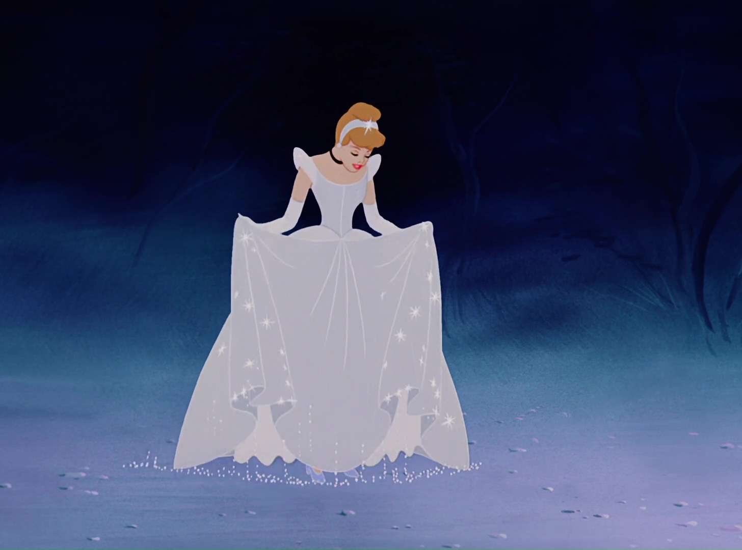 Au bal, elle est très vite repérée par le Prince qui l’invite à danser. Ils s’isolent ensuite dans le jardin où ils sont sur le point de s’embrasser quand l’horloge sonne minuit. Elle part précipitamment en laissant derrière elle un pantoufle de verre. Le sort se termine et elle se retrouve au bord de la route. Elle a toujours en souvenir le second pantoufle de verre.