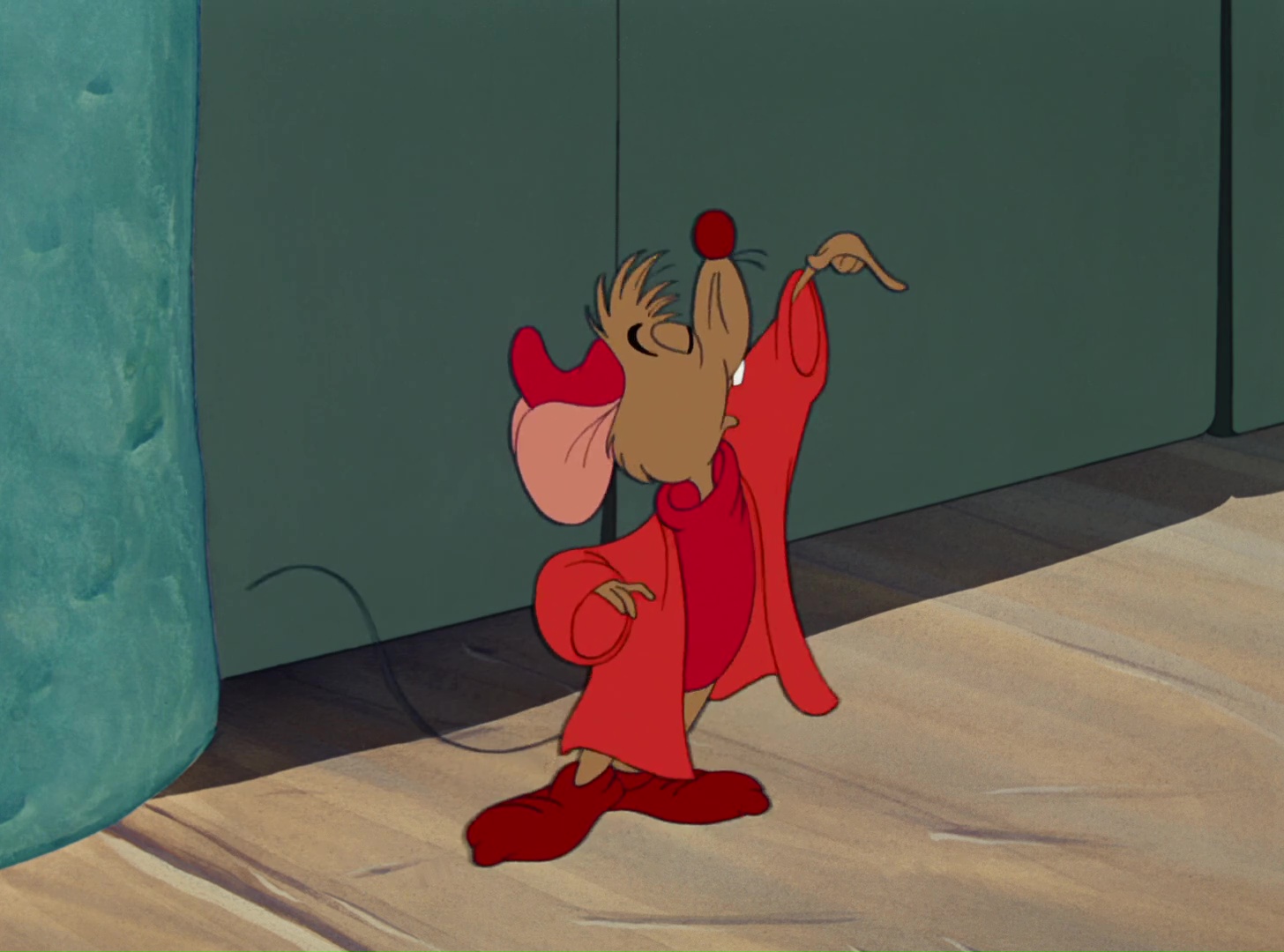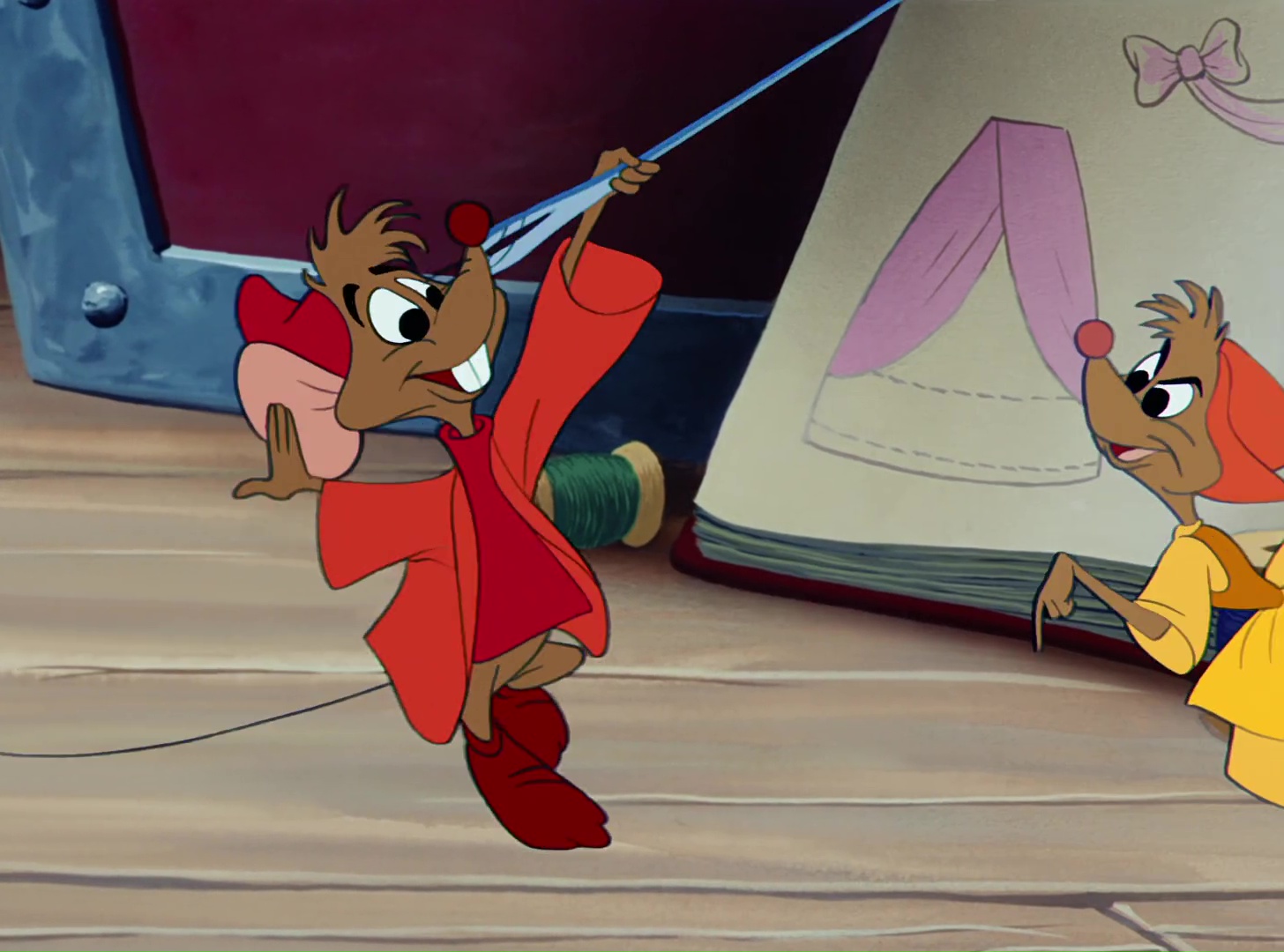 Quand il trouve Cendrillon triste de voir autant de corvées à faire alors qu’elle doit préparer sa robe de bal, il approuve l’idée de Suzy de concevoir la robe pour lui faire plaisir et participe au travail. Jaq est mis à contribution également pour aller chercher des accessoires supplémentaires. Il se rend avec Gus chercher de quoi faire mais ils doivent faire face à Lucifer qui les chasse. Ils arrivent à s’enfuir avec leur précieux butin.