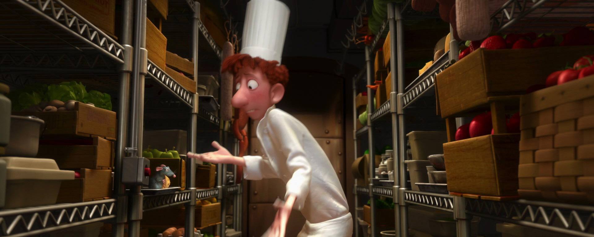 Linguini : Bon alors, réfléchissons. Toi tu sais faire la cuisine et moi je sais… je sais… faire euh… l’homme. Il faut qu’on mette au point un système pour que j’exécute les gestes que tu veux que je fasse mais sans qu’on s’aperçoive que je travaille sous le contrôle d’un rat. Nan mais écoutez-moi, je suis devenu complètement dingue ! Je suis dans un frigo en train de parler à un rat !