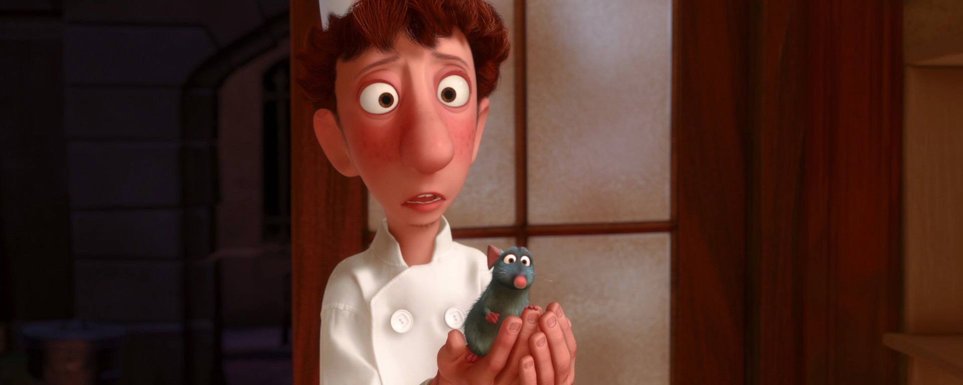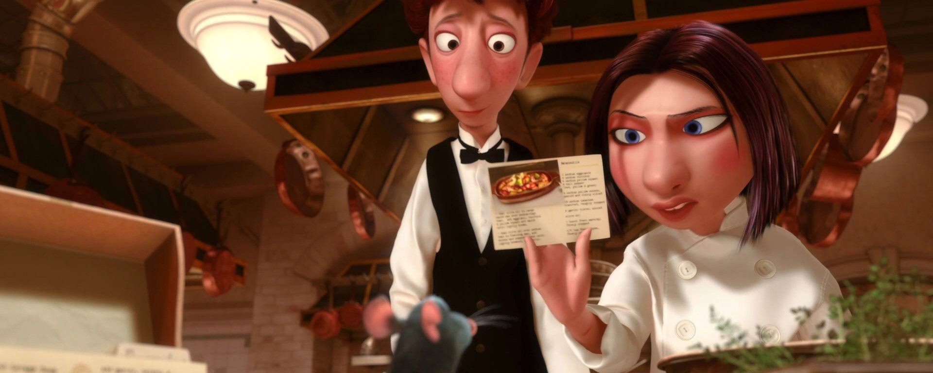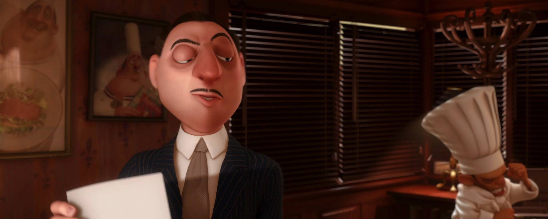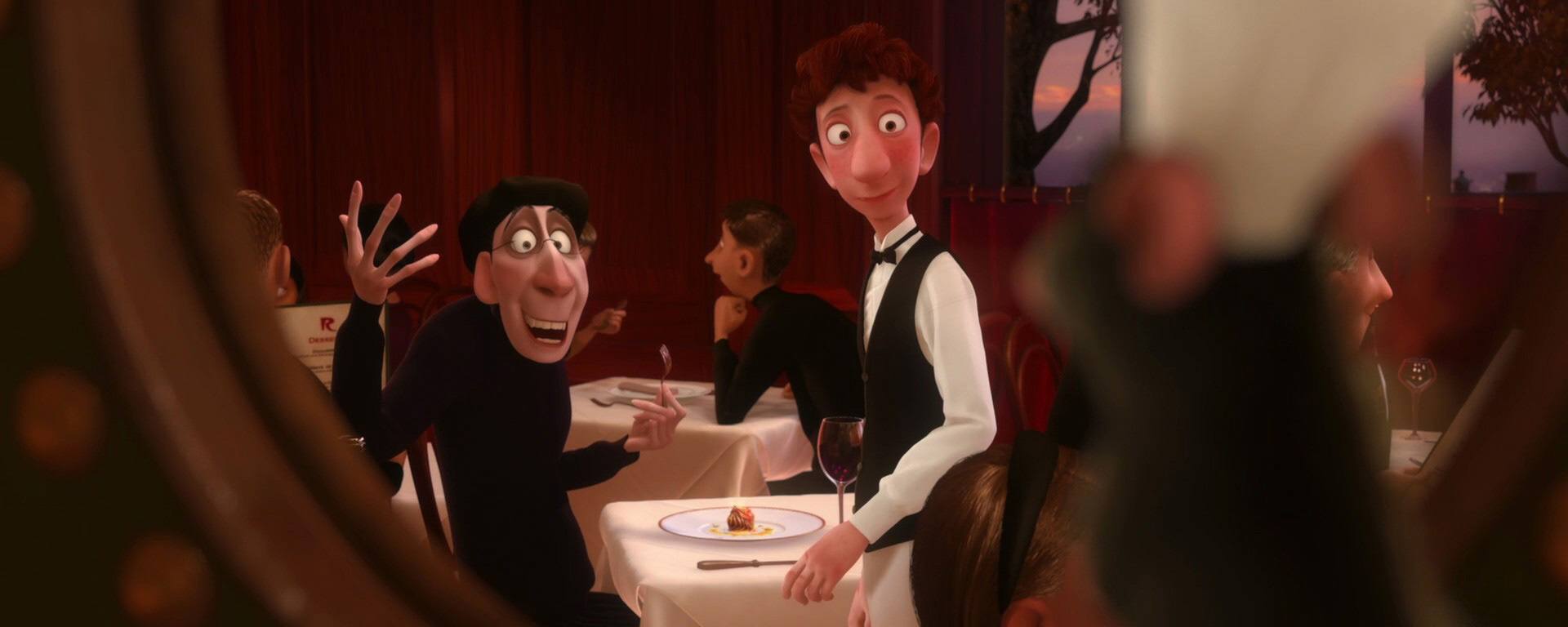 Linguini : Je sais que ça a l’air insensé mais la vérité aussi quelque fois elle parait folle et pourtant c’est quand même la vérité. Et la vérité c’est que je n’ai pas le moindre talent. Mais ce rat, c’est lui le créateur de tous ces plats, c’est lui le cuisinier, le vrai cuisinier. Il était caché sous ma toque, il guidait tous les gestes, c’est grâce à lui que je peux cuisiner ces plats qui ont enthousiasmé tout le monde et qui ont fait que Ego est assis dans la salle ce soir. Le don que vous m’avez attribué en fait c’était le sien. C’est difficile à croire je sais bien mais vous avez bien cru que je savais faire la cuisine. Écoutez. Ça marche. C’est bizarre mais ça marche. On peut devenir le plus grand restaurant de Paris et ce rat, ce petit chef de génie sera notre guide.