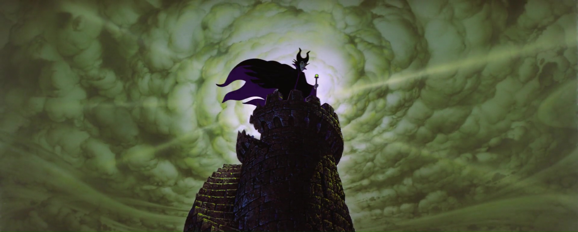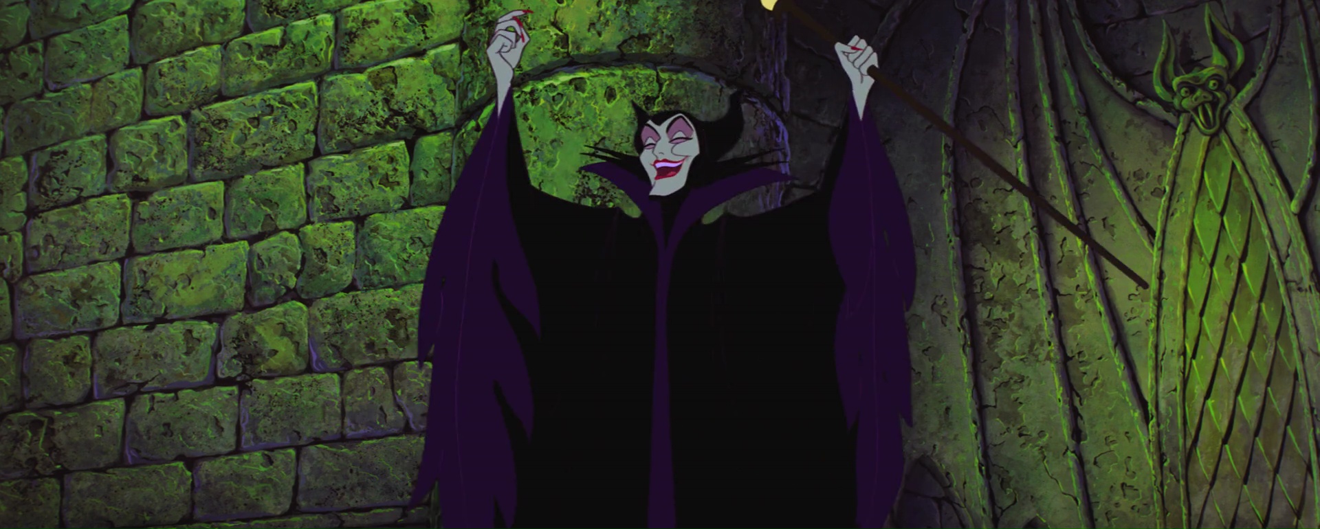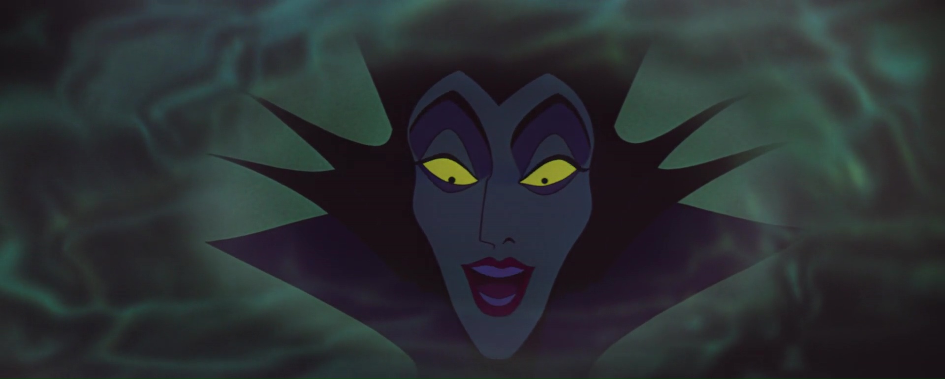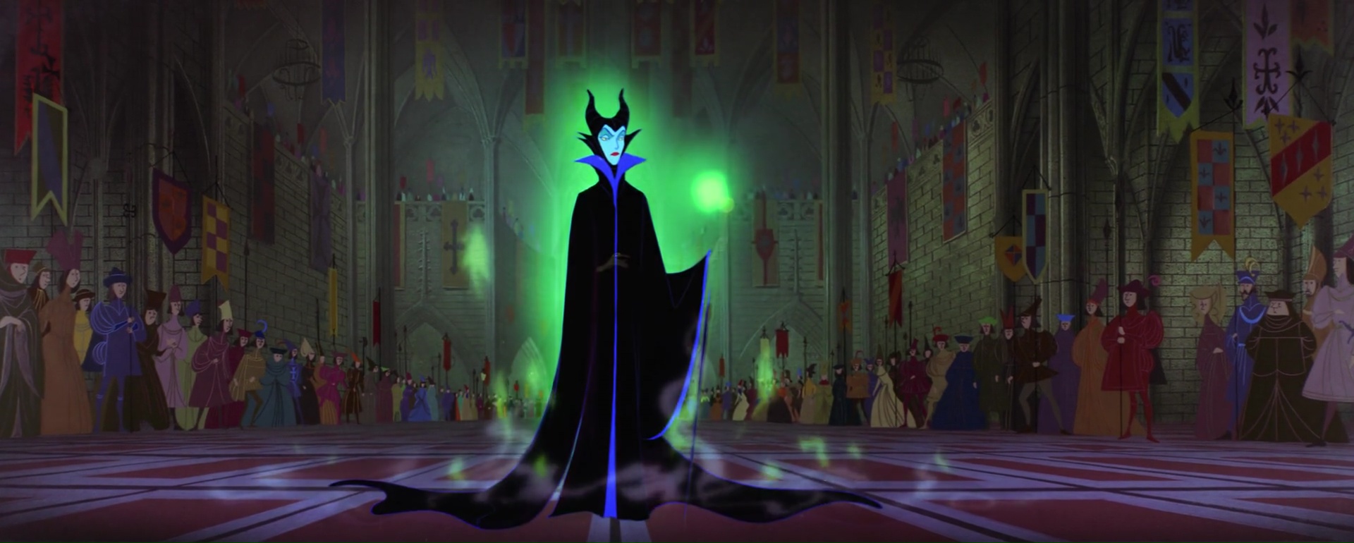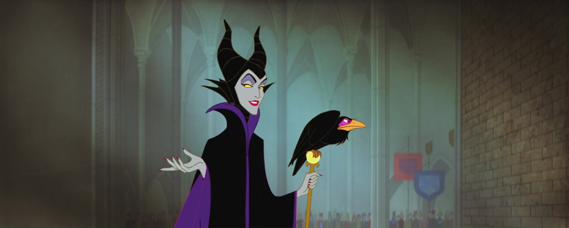 Lors de la célébration de la naissance d’Aurore, elle fait son apparition en contestant le fait que tout le monde a été invité sauf elle. Pour se venger, Maléfique lance une malédiction sur Aurore qu’à son seizième anniversaire, elle sera piquée par une quenouille et qu’elle en mourra.