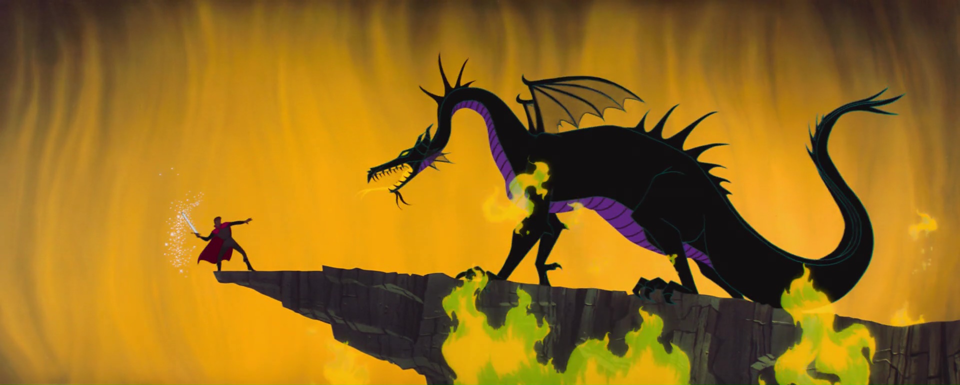 Afin d’empêcher le contre-sort de sa malédiction, Maléfique emprisonne le Prince Philippe. Quand il parvient cependant à s’évader, elle lui barre la route avec des ronces. Finalement, elle se transforme en dragon pour le provoquer en duel. Alors qu’elle prend le dessus, Philippe lui enfonce son épée en plein cœur et elle meurt.