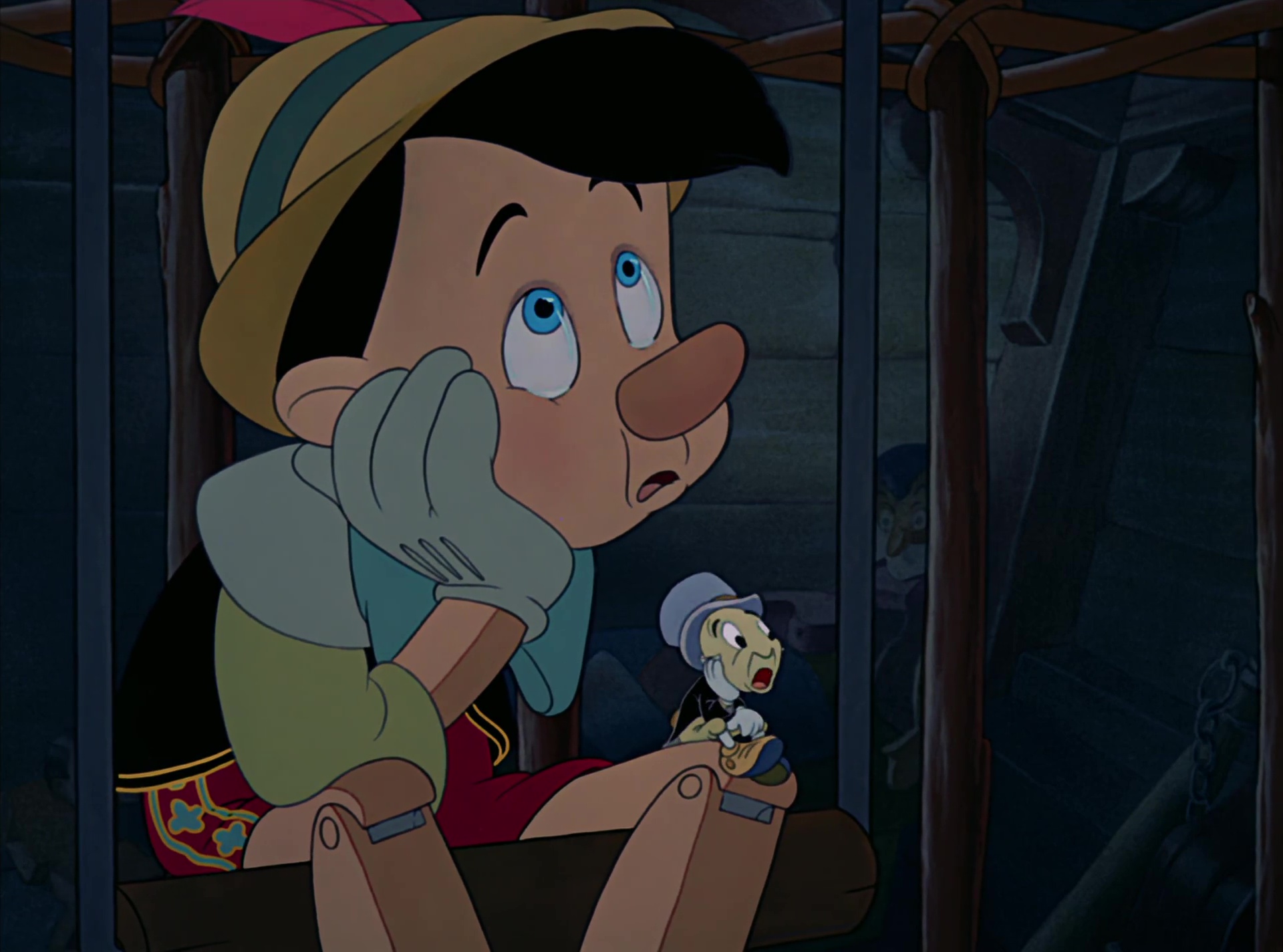 Triste, il reçoit l’aide de Jiminy Cricket pour se libérer mais son ami ne parvient pas à ouvrir le cadenas. La Fée Bleue fait son apparition et cherche des explications. Il se met à mentir et son nez ne fait que grandir à chaque mensonge. Il reçoit ainsi une bonne leçon et la Fée Bleue lui offre une seconde chance de retourner sur le droit chemin et le libère.